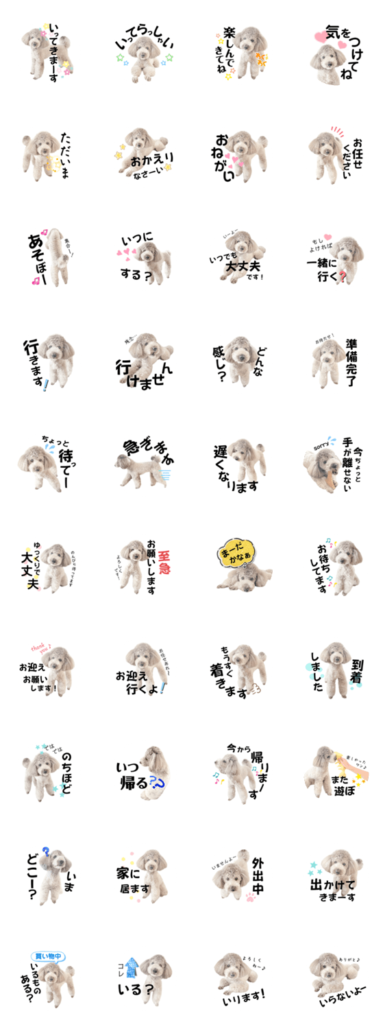 犬の写真スタンプ。シルバートイプードルの元気で甘えん坊な男の子です。是非シリーズでお楽しみください!お出かけの約束や待ち合わせ、お買い物中に便利なセットです