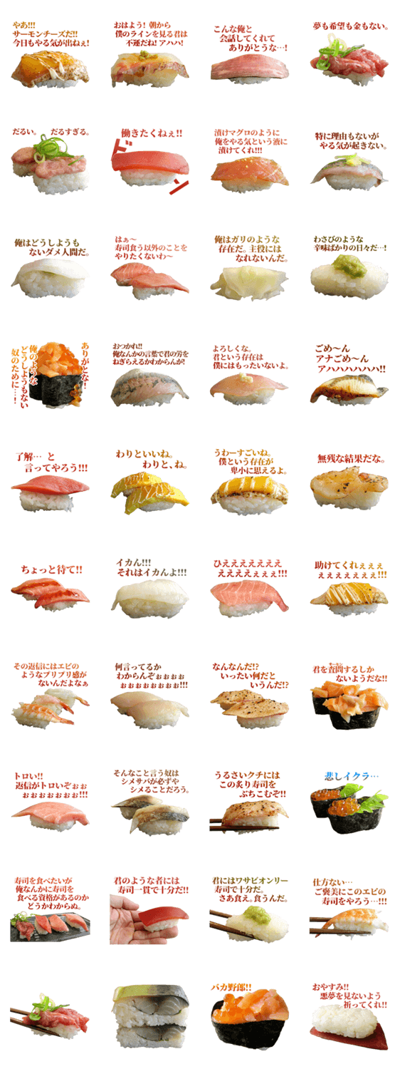 ネガティブなお寿司のスタンプです。ネガティブ発言もお寿司ならきっと飯テロに変わるでしょう。魚介類、マイナス思考、暗い、毒舌、煽り、実写食べ物スタンプシリーズ。