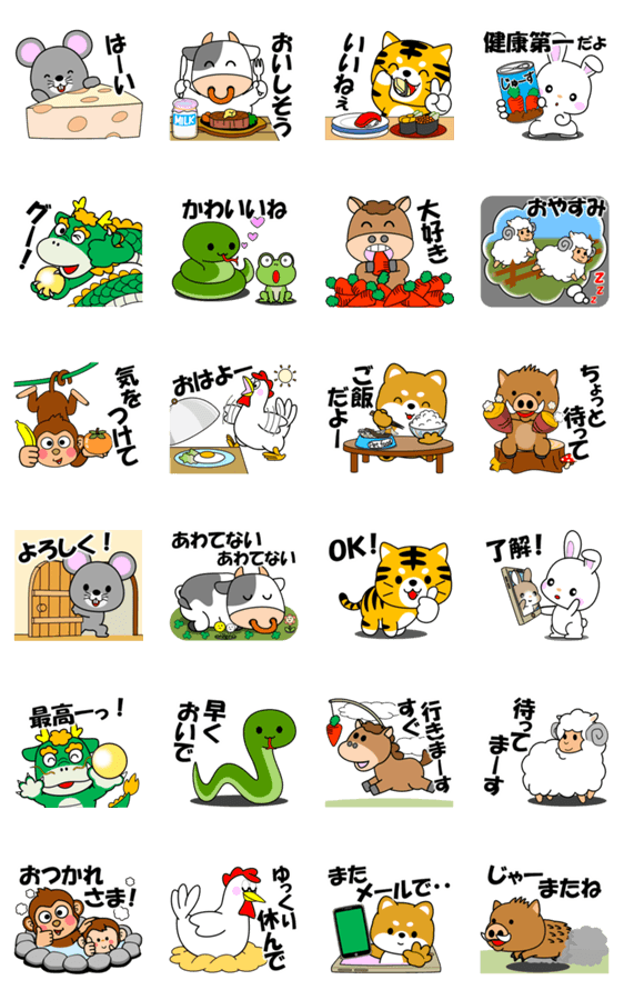 いつでも使える挨拶や言葉を詰め込んだ、十二支の動物たちの飛び出すスタンプです。