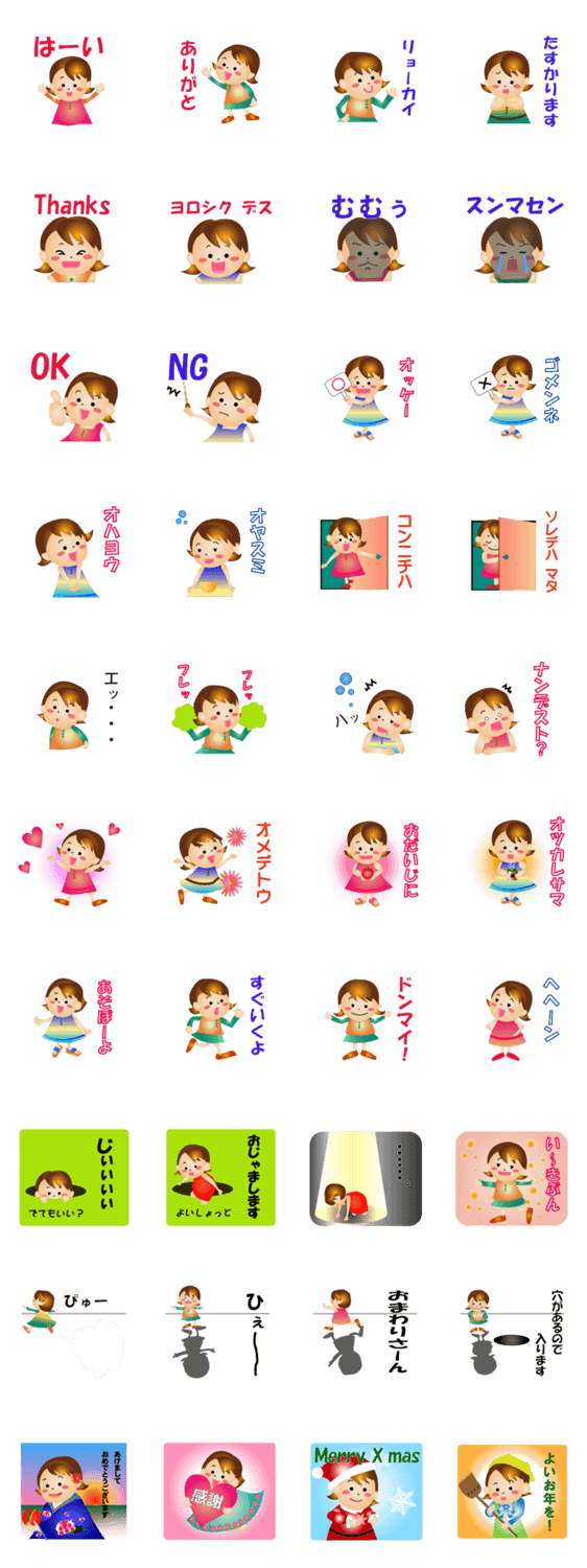 日常的に使える可愛い女の子のスタンプです。「よろしく」や「ありがとう」等、使いやすい会話スタンプに加えて、お正月やバレンタイン、クリスマスバージョンもあります。