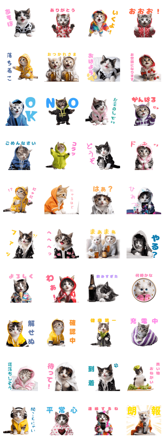 とてもキュートなにゃんこが描く日常使いのスタンプです。AI画像を使い、まるで本物のような可愛らしさを演出しました。