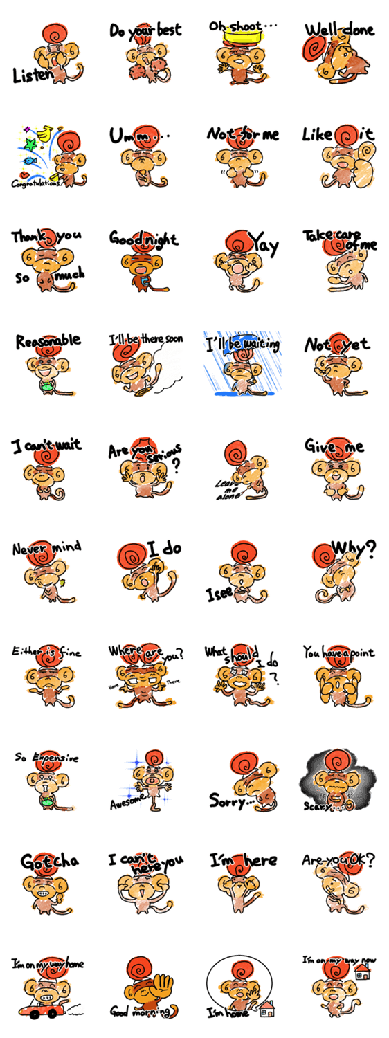 | スタンプ説明 | ソックモンキーをモチーフにした猿のスタンプ(ラフ塗)です。 特徴的な頭の赤いのはかぶっている帽子のボンボンです。 日常的に使える表現を集めたスタンプの英語版です。 |