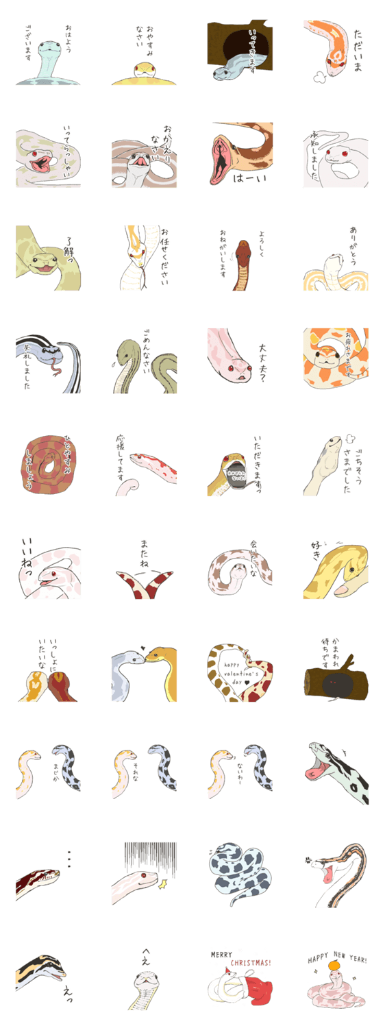 正面のキス顔が可愛い蛇、コーンスネークの使える挨拶スタンプです。愛情表現多め。