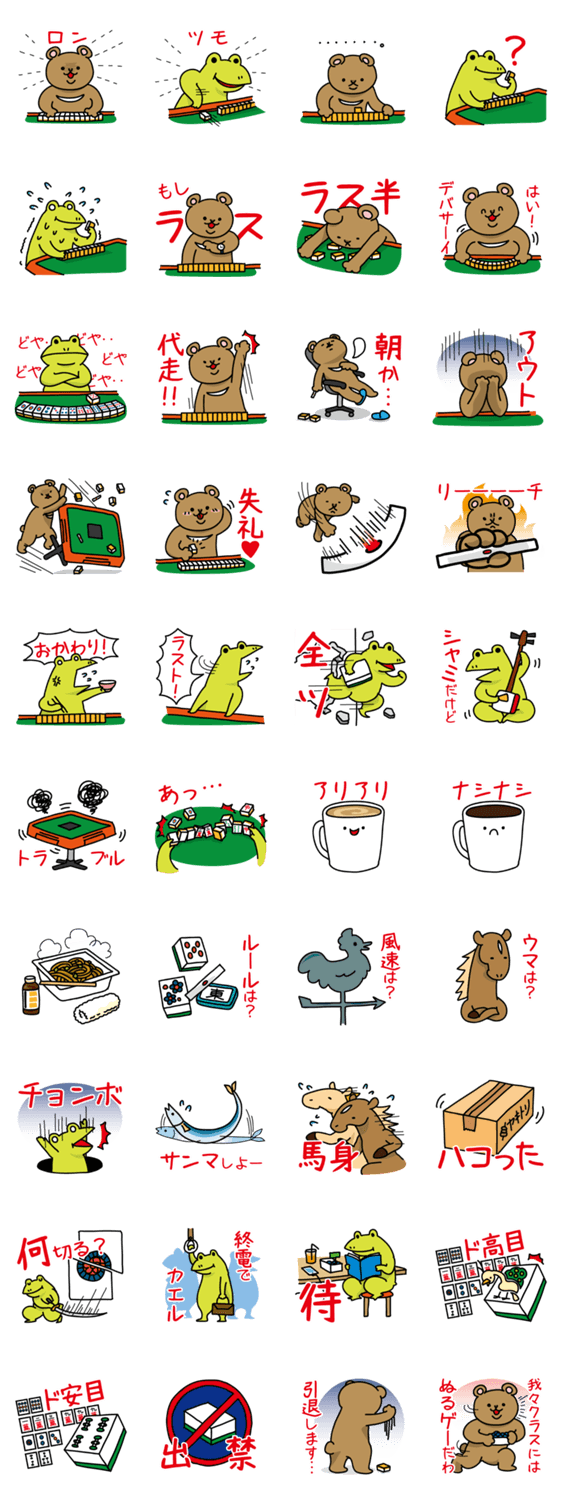 クマとカエルの雀荘&麻雀用語のスタンプです。麻雀仲間との会話だけでなく日常会話にも使えるはず。