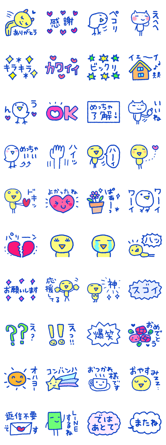 文字が大きくて見やすい、シンプルでサクッと送れる40個。意外と便利で毎日使えるコスパ最高スタンプです。かわいい鳥たちと暑い夏を楽しくお過ごしください。
