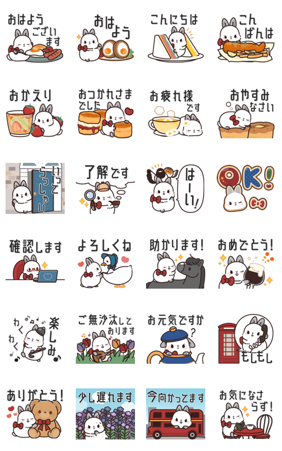 落ち着いた色合いで日常会話に使いやすい!赤いリボンを付けた可愛いうさぎのスタンプ第三弾です♪
