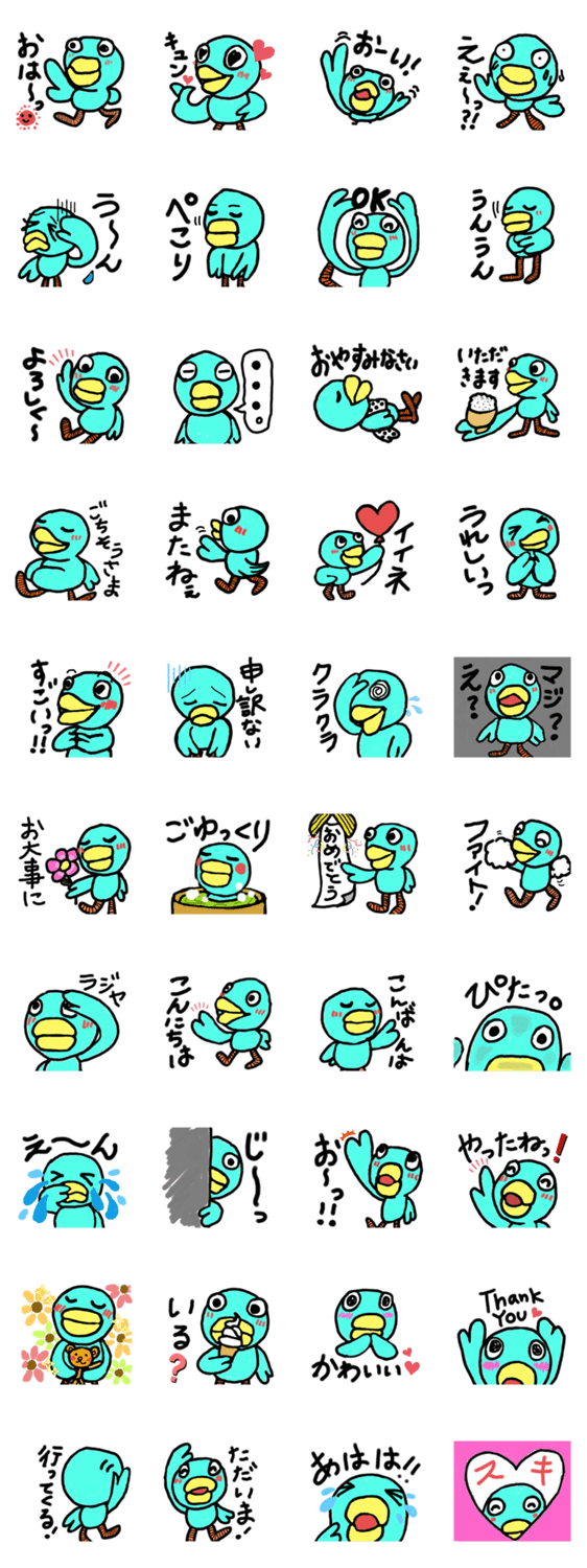 毎日の生活で使えるエメラルドグリーンの鳥、パタコのスタンプです。