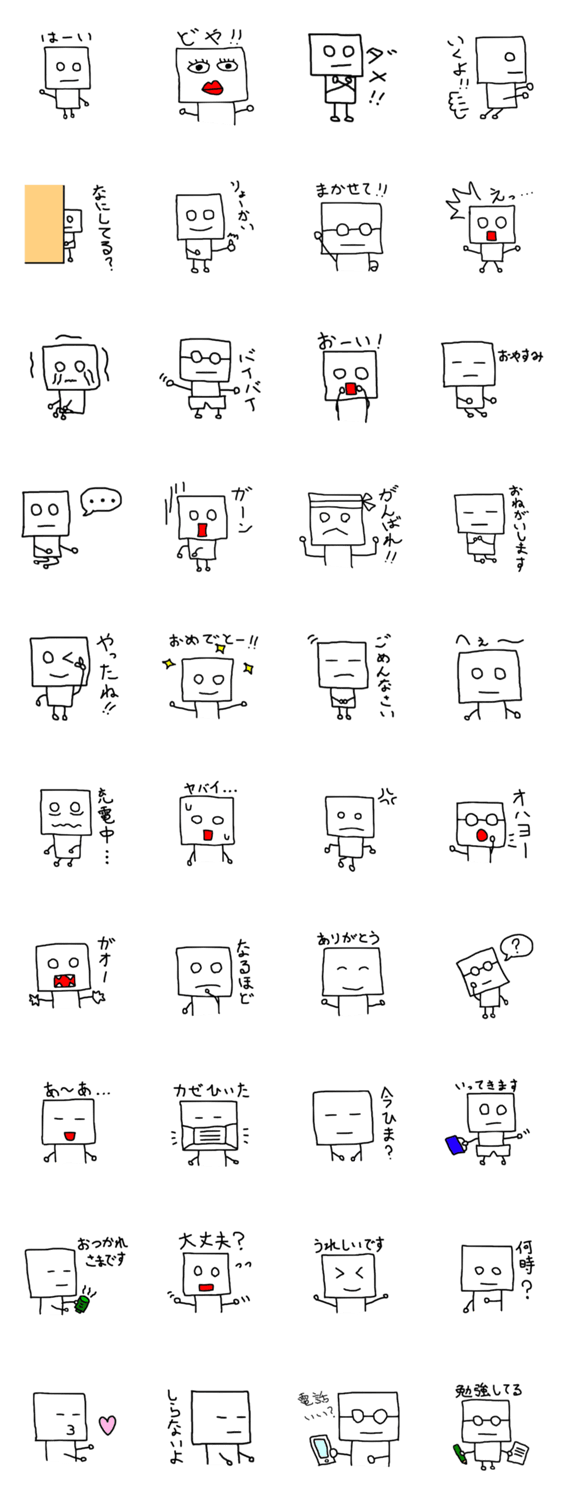 ロボットみたいな落書きから生まれたスタンプです。家族や友達との日常会話で使ってください。