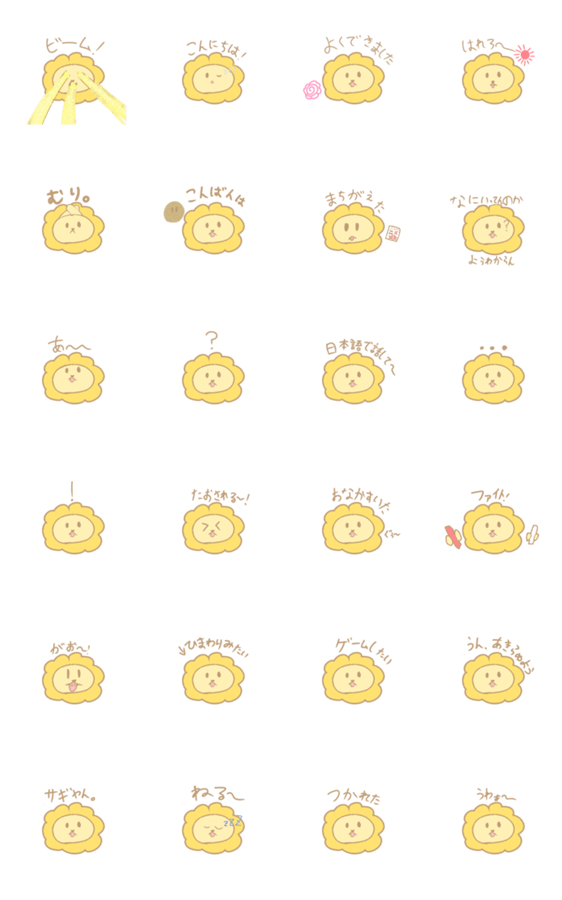 | スタンプ説明 | ライオンのゆるゆるなスタンプです。たまに意味のわからないものがあります。 |