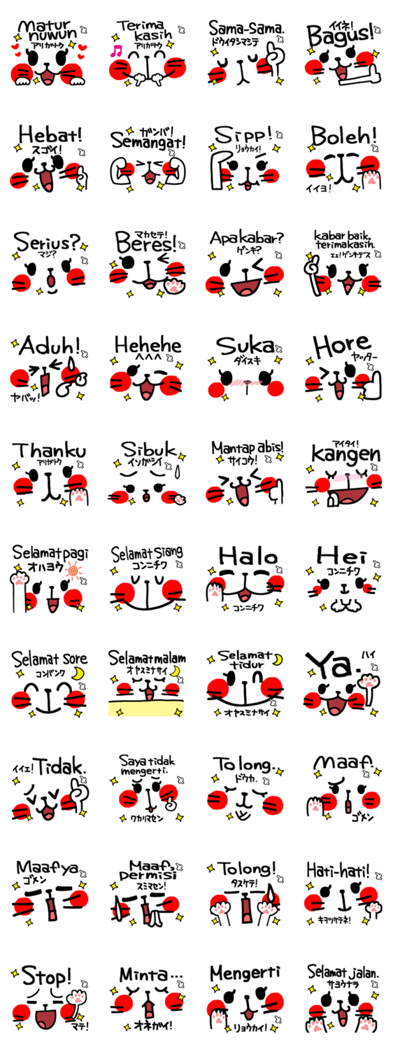 | スタンプ説明 | [マレー語&日本語の勉強。]可愛い猫。シンプル&使いやすいリアクションです。 |