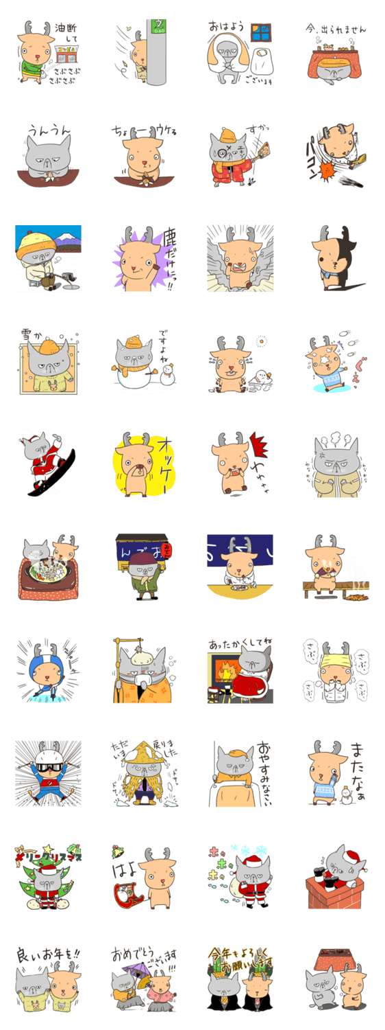 エキゾーとシカゾーが織りなす冬のスタンプです。クリスマス〜お正月のお供にもぜひ。ジカゾーは真っ赤なお鼻の鹿ということでお願いします。