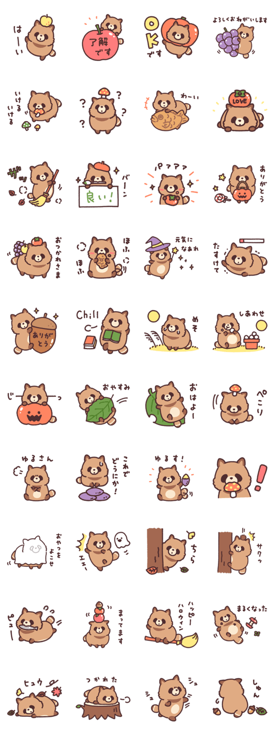 のんびりたぬきの毎日使える秋スタンプです。ほっこり秋の食べ物やハロウィン、お月見などイベントも! 秋を過ぎても使えるタヌキらしいモチーフがたくさん入っています。