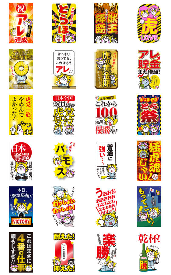 優勝記念(希望)してスタンプ第6弾が完成!虎党仲間で盛り上がりましょう!虎愛を込めてポジティブな言葉メインに作成しました。阪神エリアでプロ野球好きならぜひ! ※このスタンプはトークルームで大きく表示されるBIGスタンプです。