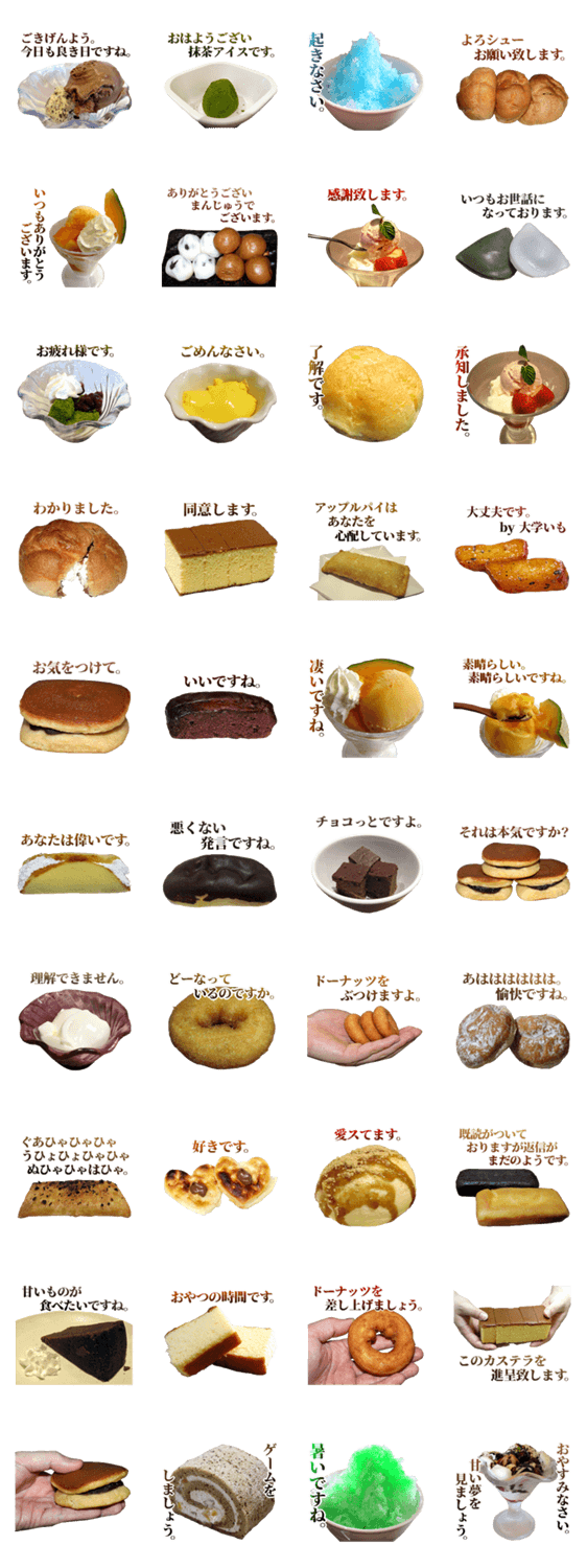 敬語を使うおやつ、スイーツのスタンプです。デザート、甘味、お菓子、和菓子、洋菓子、シュークリーム、パフェ、どら焼き、かき氷、カステラ、ドーナッツ、丁寧語。実写。