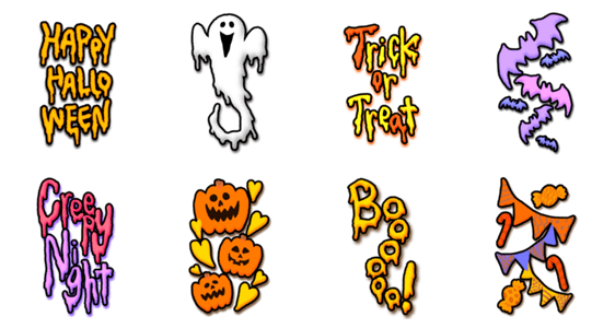 ハッピーハロウィン・トリックオアトリート・スプーキーナイト・南瓜・オバケ・蝙蝠・お菓子などの怖可愛い秋のスタンプ★画面にひろがるドロドロホラーデカ文字スタンプ! ※このスタンプはトークルームで大きく表示されるBIGスタンプです。