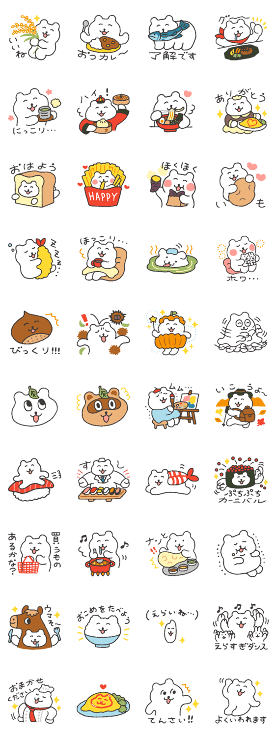 ほっこりと 秋の香りに癒されながら 美味しい食べ物と季節を楽しむ すこやかなしろくまのスタンプです。LCSP対象スタンプです。※LCSP:LINE Creators Support Program