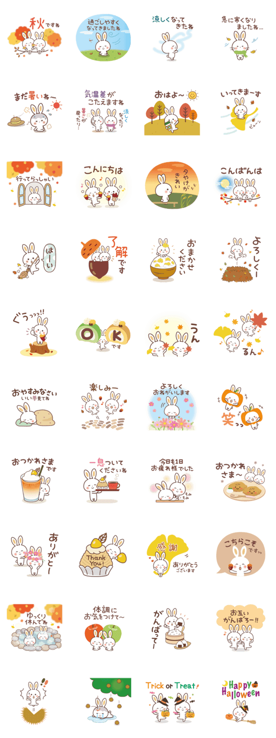 ふわっとした「うさぎ」の [ 秋 ]スタンプです♪ (紅葉/ハロウィン/モンブラン/焼き芋/季節の挨拶など)