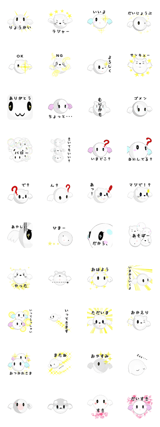 しあわせと癒しを呼ぶチカラをもつ可愛いまんまる妖精のスタンプです。マルい形には丸くおさめる力があり、金黄色の光は幸せを運びます。かわいい「くま」「ねこ」います。