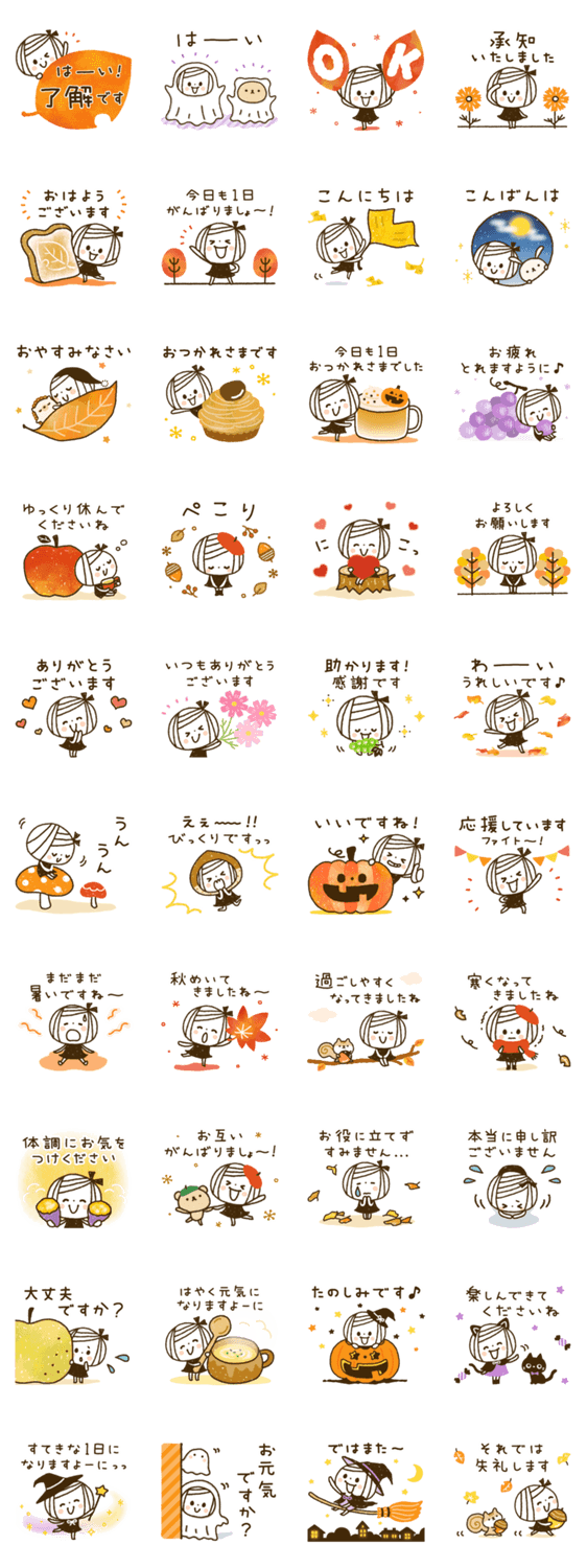 夏の終わりから秋にかけての日常に使える、ゆるボブGIRLのスタンプです♪文章は敬語です*。..気遣い/丁寧/大人かわいい/ボブヘア/女の子/紅葉/ハロウィン/フルーツ