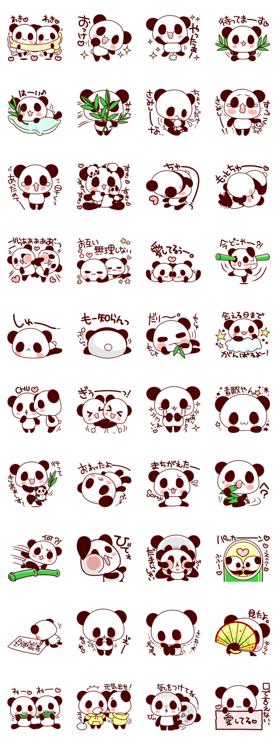 パンダ大好き、パンダだらけのスタンプ。恋人(彼氏・彼女)や家族、友達や仲間、男性女性、様々な人に愛を伝えるラブラブスタンプ。同じ顔の男女兼用♪
