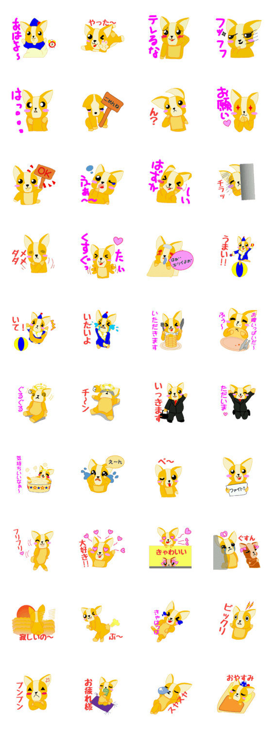 ぼくはコーギーだよ。名前はモモって言うんだ。今回は第一弾です。このスタンプは、ぼくの感情を表現しているんだよ。ぼくのスタンプを使って楽しんで下さい。