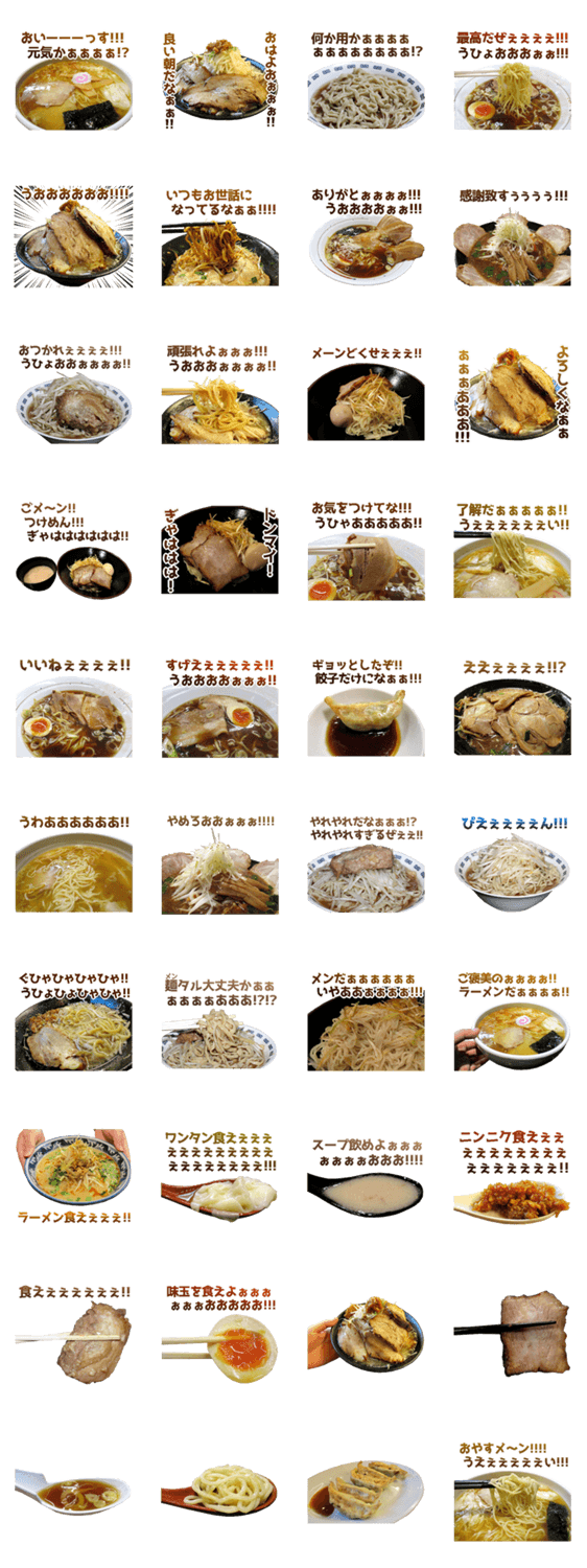 テンションの高いラーメンのスタンプです。飯テロ、拉麺、らーめん、麺類、パリピ、明るい、チャーシュー、餃子、味玉、つけ麺、ヌードル。実写食べ物スタンプシリーズ。