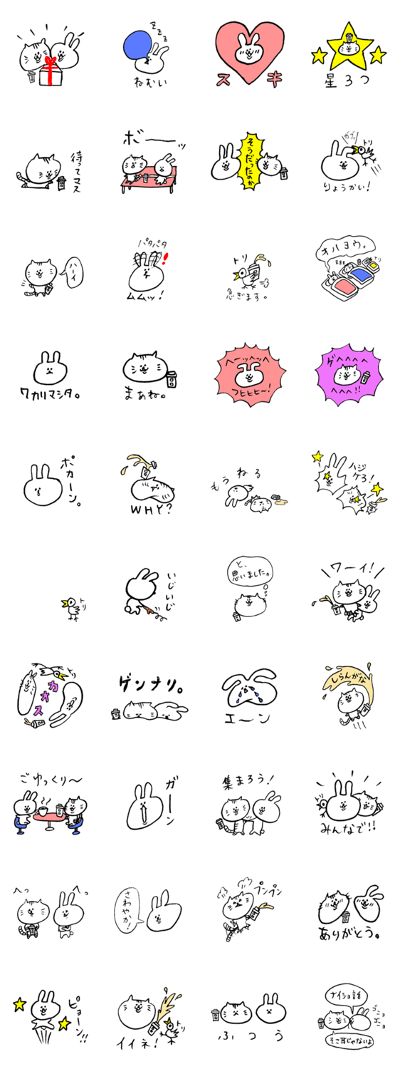 | スタンプ説明 | ヘチマと言う名のうさぎと、タケノコと言う名のねこのちょっと変わったLINEスタンプの第2弾です。 |