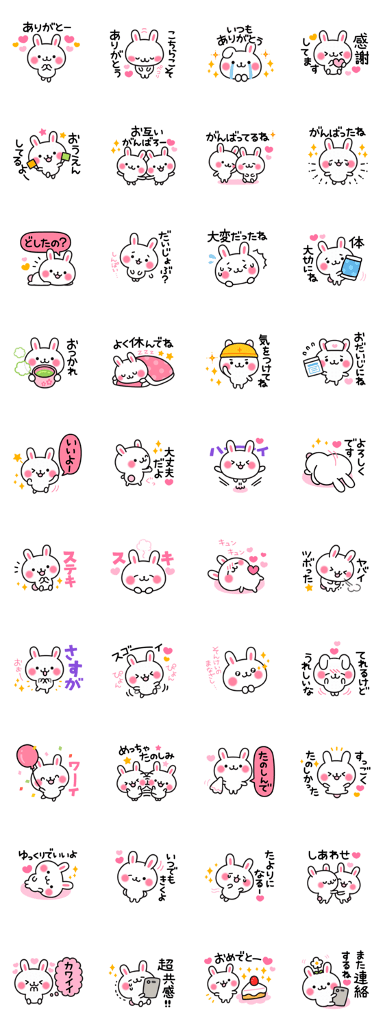 相手を思いやる優しい気持ちをキュートに伝えてくれるうさぎのスタンプです。日常で使いやすい言葉中心♪