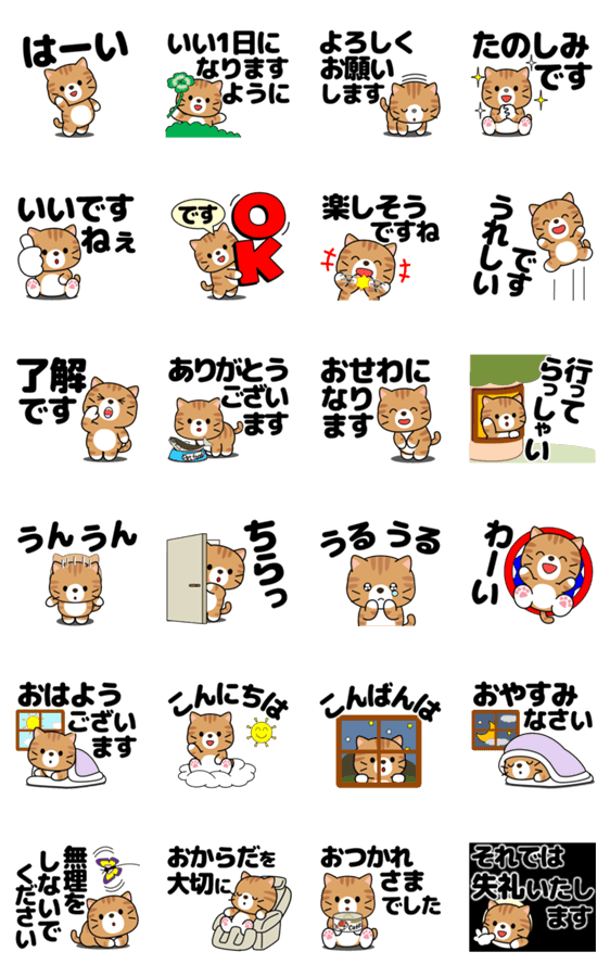 茶トラ猫の飛び出すスタンプです。挨拶や返事など毎日便利に使えます。文字は見やすいデカ文字です。