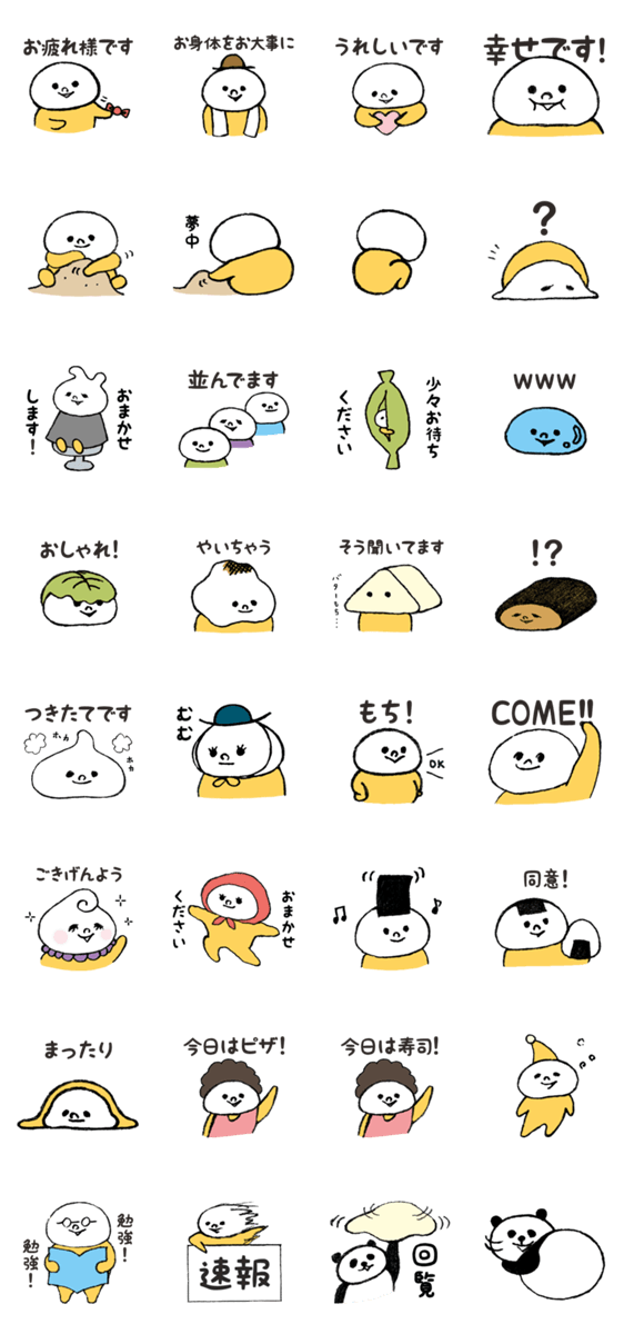 まるっともっちりもちぼんのスタンプ第13弾です。色々なもちぼんをお楽しみください。もちぼんにとってピザとスシは特別感が増すようです。