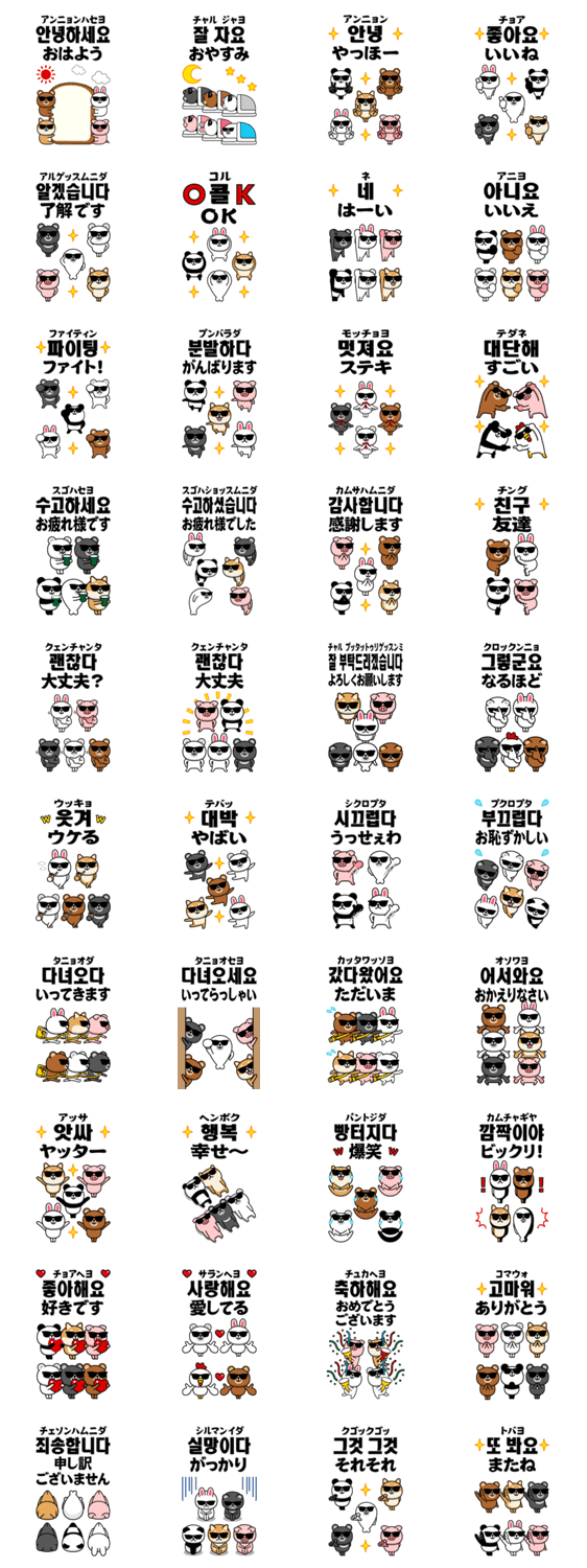 | スタンプ説明 | グラサンアニマルズ/アザラシ/ニワトリ/熊/うさぎ/柴犬/パンダ/ブタ/毎日使える/日常会話/使いやすい/挨拶/楽しい/シンプル/あいさつ/韓国語/かんこくご/ハングル/韓流 ※このスタンプはトークルームで大きく表示されるBIGスタンプです。 |