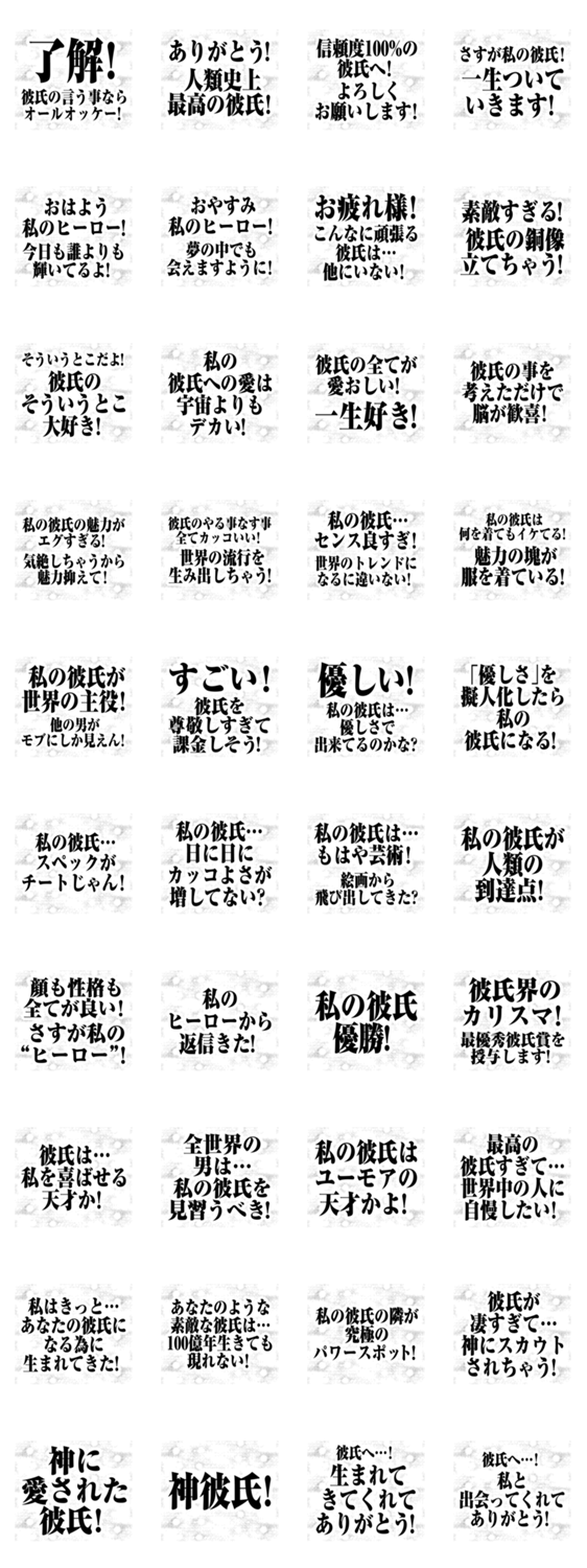 このスタンプに出会ってくれたあなたが大好きだ! 彼女から彼氏へ、あなたのありったけの想いを伝えよう! 毎日使える/笑える/面白い/ネタ/日常/褒める/カップル/恋愛