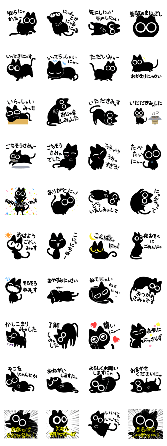 ねこ独特の姿や変なポーズで敬語な猫語、大きな文字のスタンプです♩家族友達、彼氏彼女、仲良しに♩日常挨拶返信感謝気づかい/黒猫ケイゴ/にゃん/にゃー/大きめ大きい文字