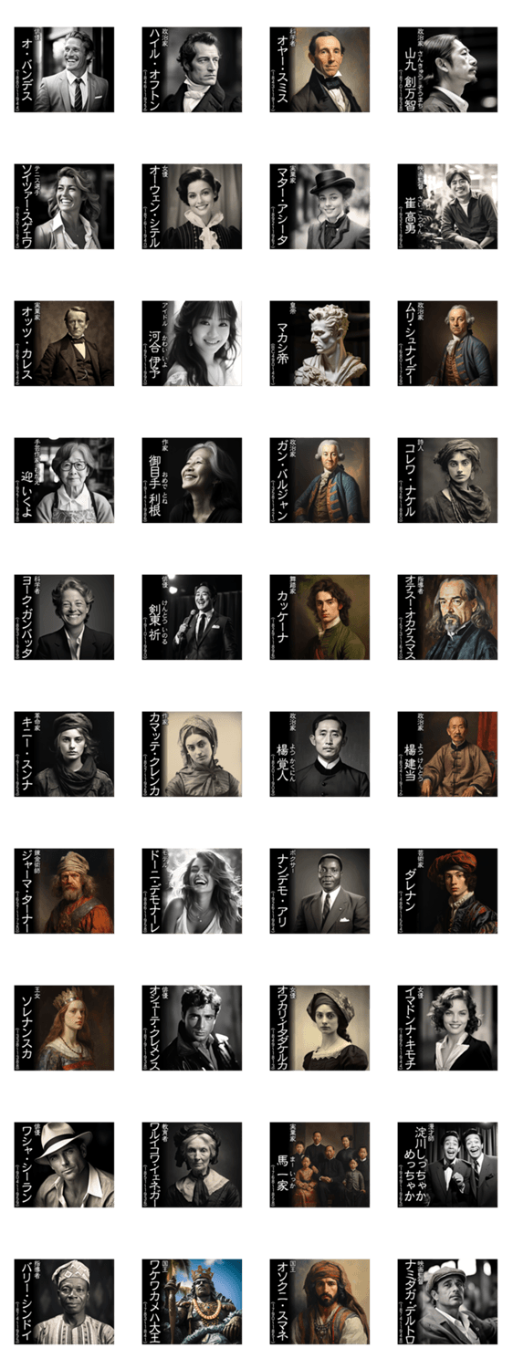 | スタンプ説明 | 世界中の架空の偉人を集めました!日常的にダジャレ的に使える偉人ばかり!歴史好き、煽り、口喧嘩に使えるシュールなおもしろいネタスタンプです。 |