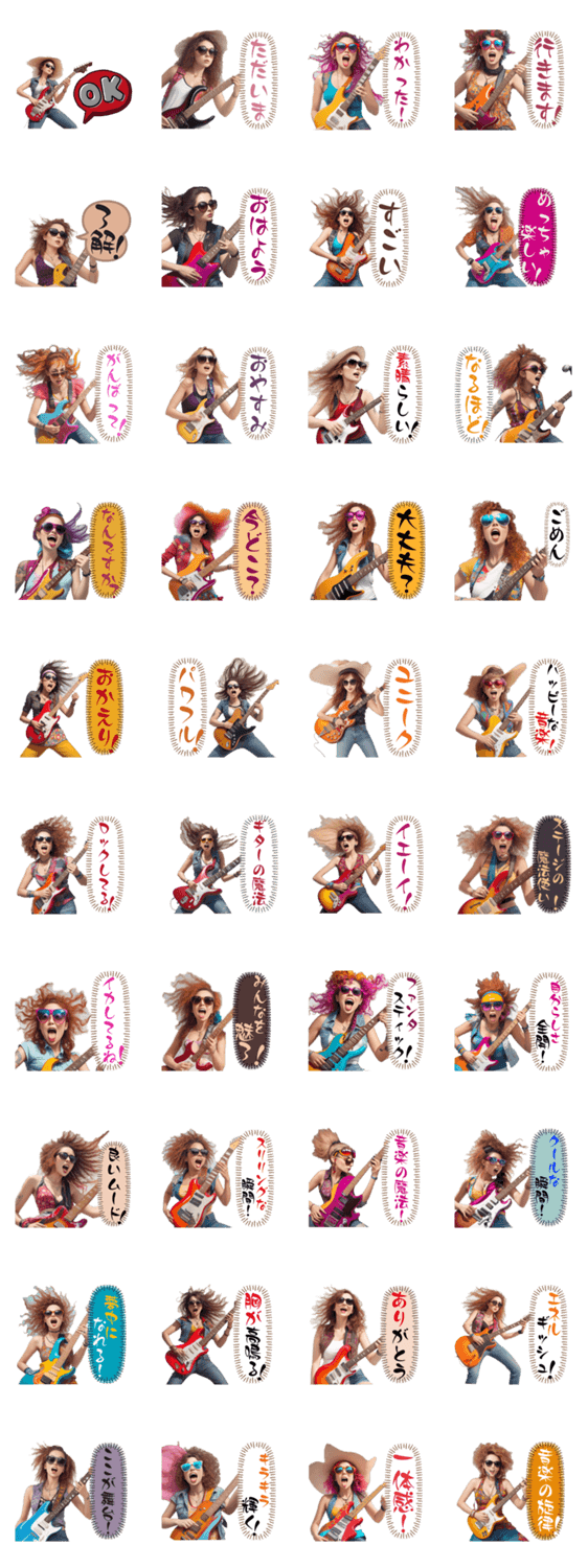 ギターを持って叫んでいる女性のイラストと共に、言葉では表しきれない感情や雰囲気を素敵に表現してくれるスタンプです。