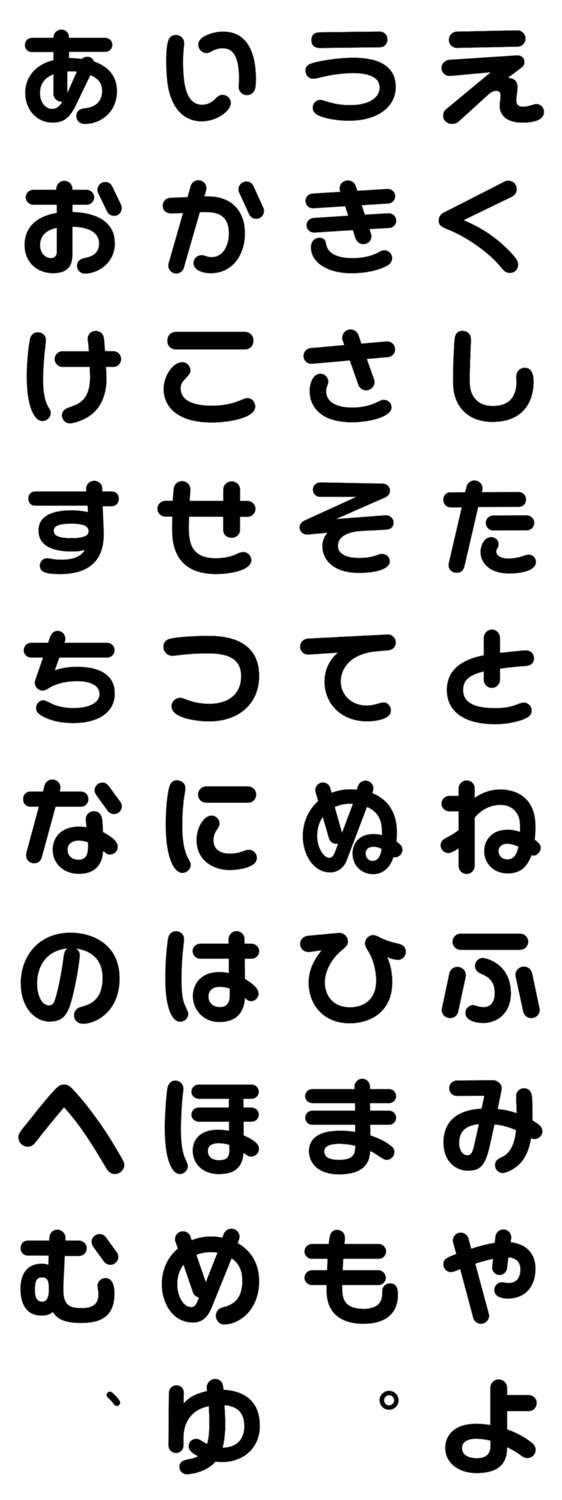 文字一覧:あいうえお・かきくけこ・さしすせそ・たちつてと・なにぬねの・はひふへほ・まみむめも・や、ゆ。よ