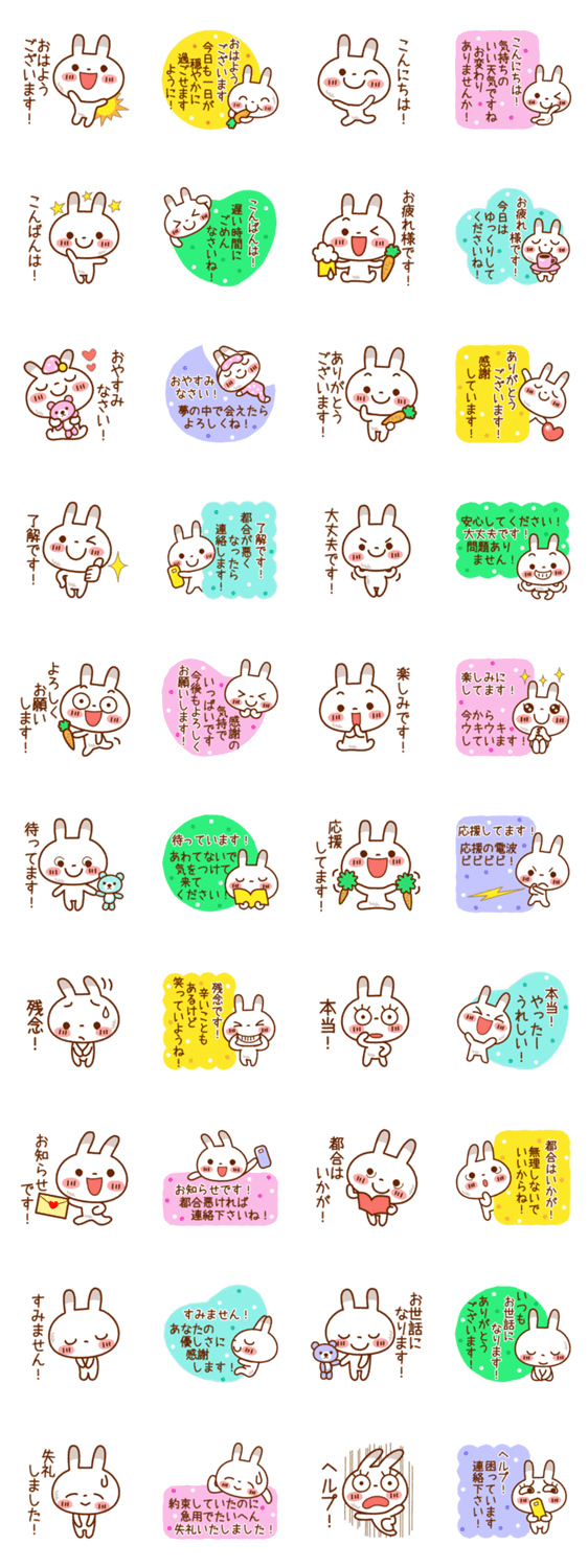 ブチうさぎシリーズの第7弾。よく使う短文、長文の言葉が選べるスタンプです。毎日の会話で上手く使いこなしてくださいね。