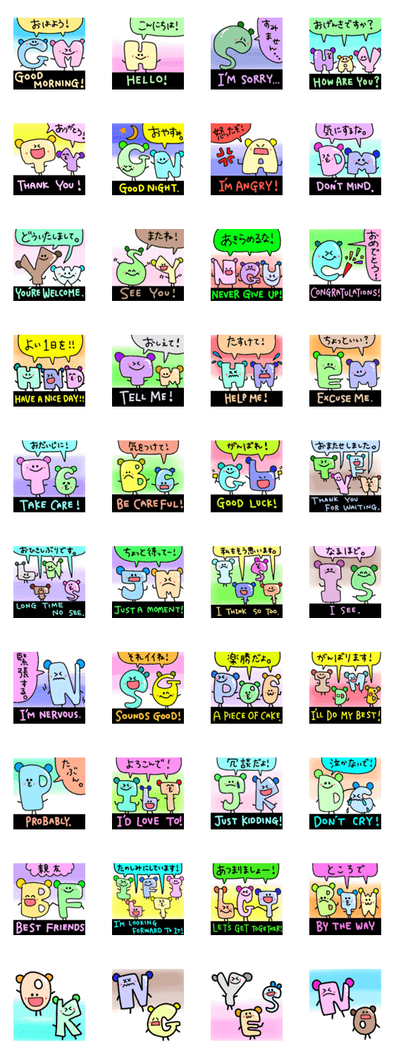 1つのスタンプに英語と日本語の両方が書かれています。コミュニケーションだけではなく、英語の勉強にも使って下さい!キャラクターは、それぞれの英単語の頭文字です。