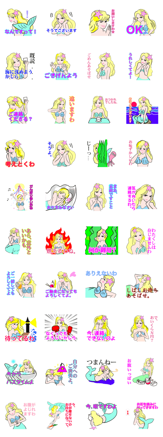 毎日使える美人で綺麗なセクシーセレブなおもしろお嬢様の人魚姫スタンプ。お嬢様言葉の人魚姫でお上品に彼氏から友達まで幅広くお使いください。人気者になれるかもですわ
