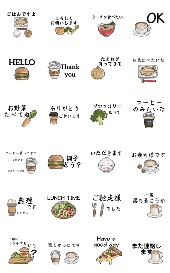 食べ物とデカ文字のスタンプです。面白おかしい組み合わせを是非♡ ネタ/主婦/料理/カフェ/コーヒー/野菜