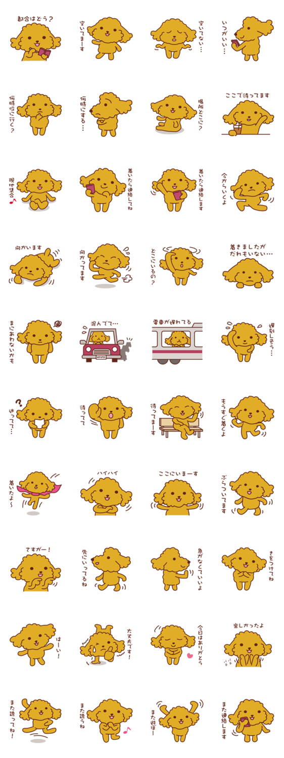 モフモフな毛並みのトイプードル「モフプー」のスタンプ第3弾。 お約束や待ち合わせに使えるスタンプです。