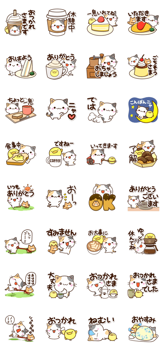 三毛猫『ちびミケ』のコーヒーや食事等、カフェ系のねこスタンプ。ハチワレ等のネコ好きの方に。【かたこ】ひよこ・柴犬・ケーキ・マンチカン・スコティッシュフォールド
