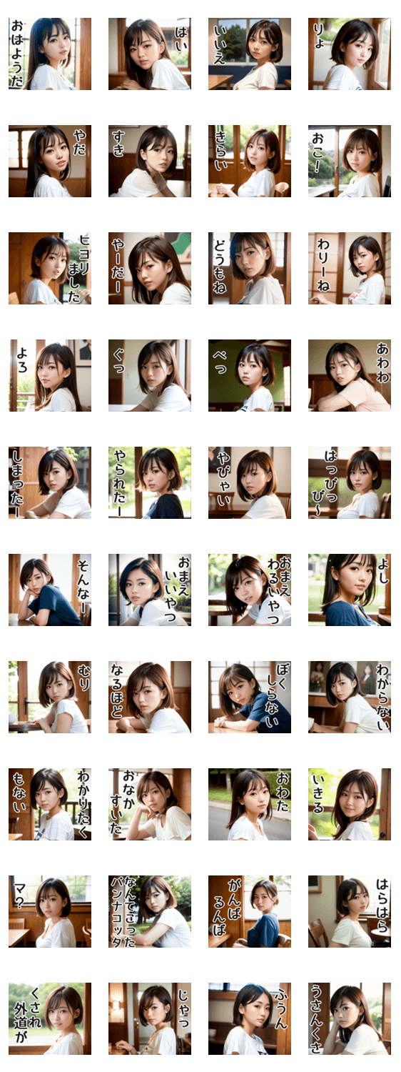 ゆるい女の人のスタンプです。使いやすく丁寧に仕上げました。おまえ、いいやつ、おはようだ、はい、いいえ、りょ、やだ、すき、きらい、いきる、じゃ、くされ外道。
