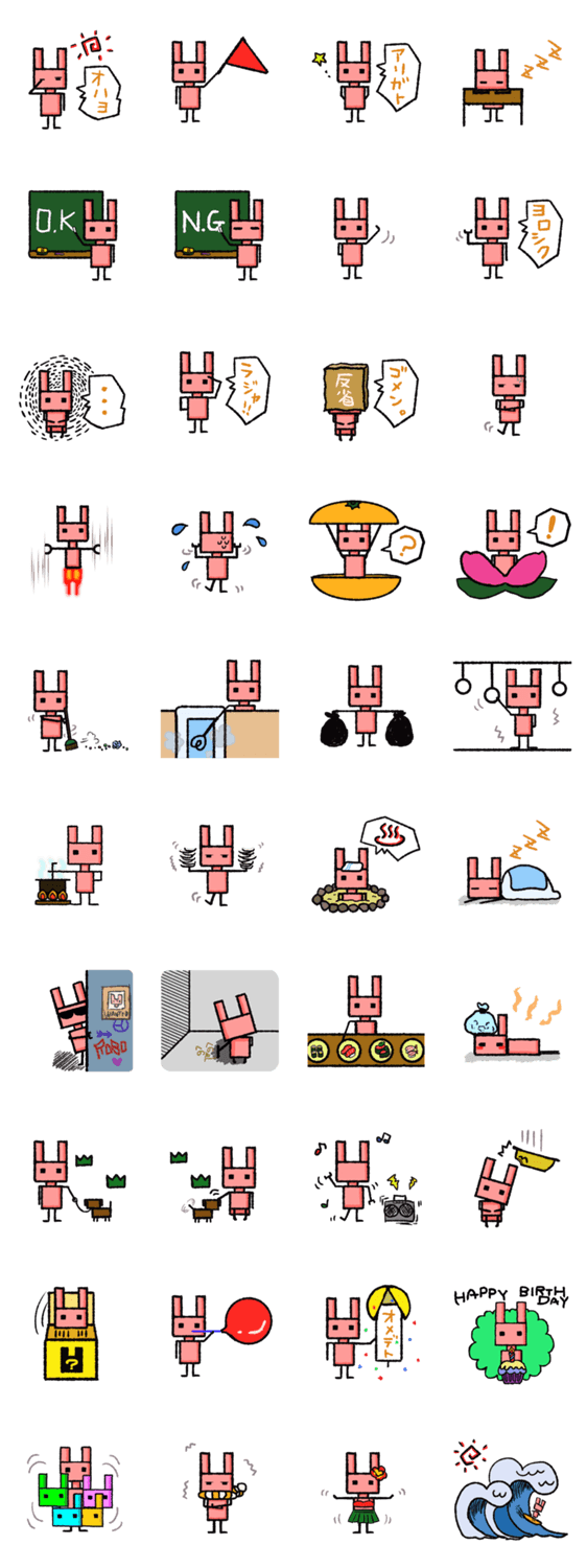 | スタンプ説明 | 「ロボうさ」は、日々の暮らしをエンジョイ中。お掃除、炊事、飼い犬の散歩と家事をこなしつつ趣味も楽しみます。シュールなかわいさが魅力のスタンプをぜひ使ってね☆ |
