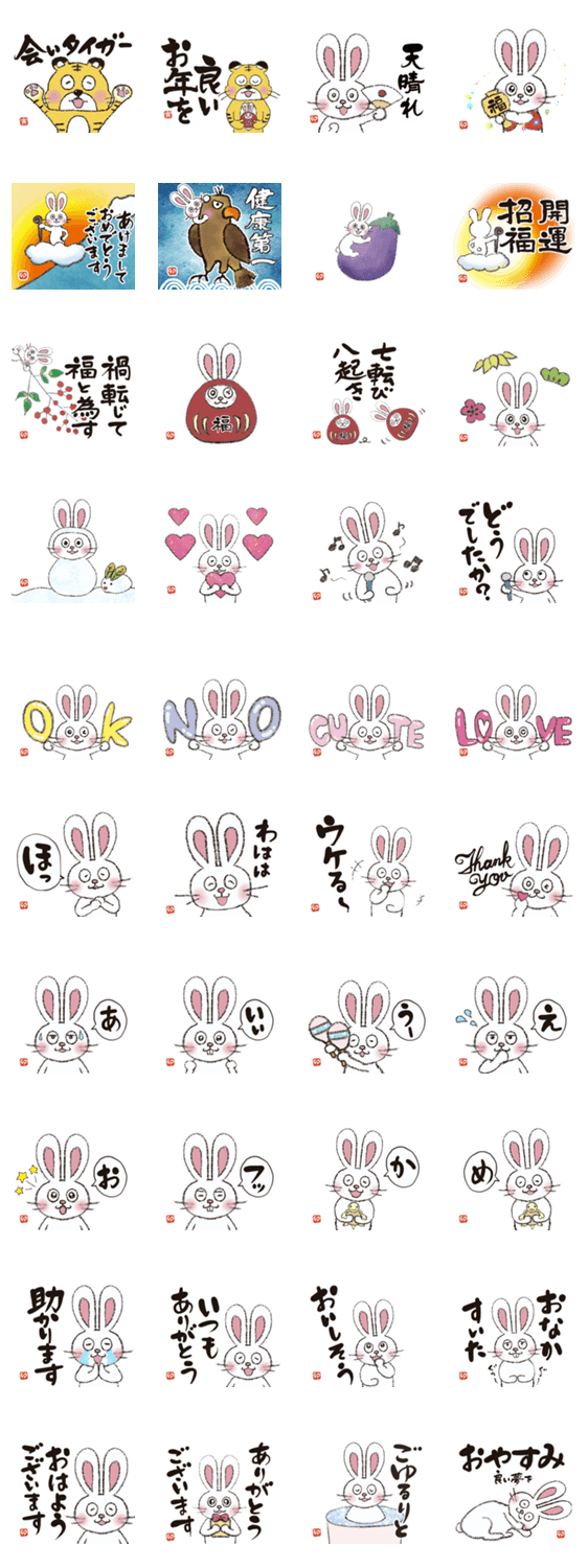 うさぎのうーちゃんの年末年始に使えるスタンプ第2弾です。 縁起物を散りばめています!年末と新年の挨拶・日常会話にお役立てください!!素敵な1年になりますように☆