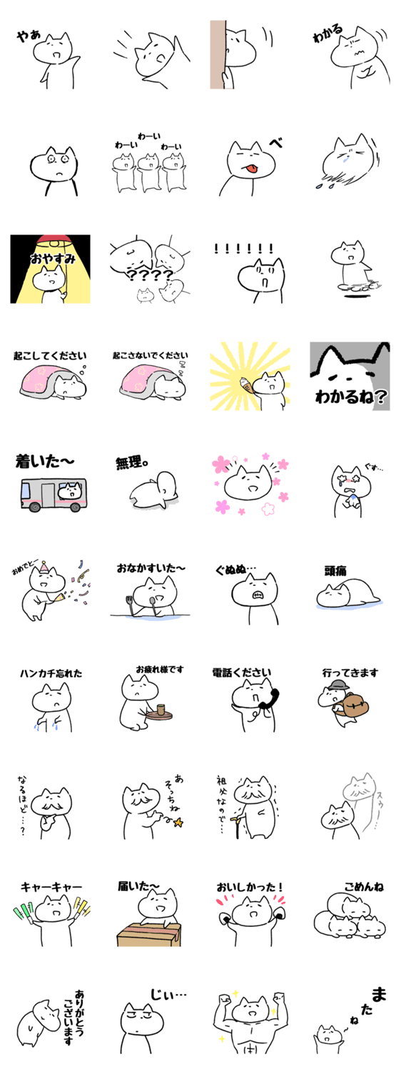 ネコのような姿の白いいきもの(じぃ)がのんびり暮らしている様子のスタンプです。日常に彩りを添えてくれるかもしれません。