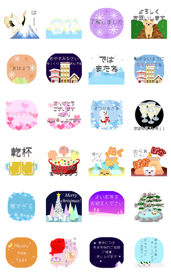 寒い冬によく使うメッセージや、年末年始、喪中、寒中見舞い、クリスマス用のスタンプを取り揃えました。シンプルな飛び出すスタンプです。