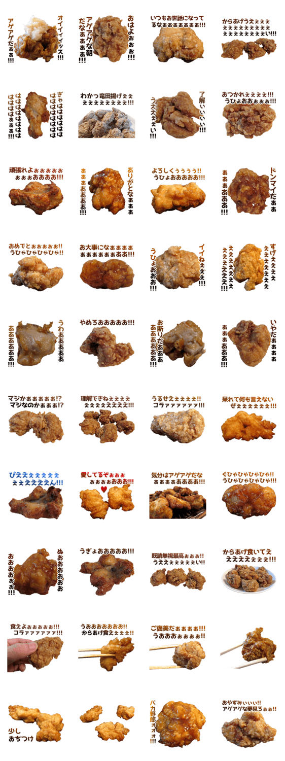 テンションが高い唐揚げのスタンプです。見るだけで食欲が刺激され気分が高揚するカラアゲという最強の食べ物。飯テロ、明るい、Chicken、竜田揚げ、実写食べ物スタンプ。