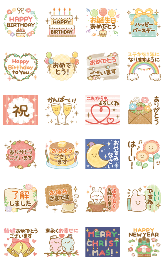 | スタンプ説明 | やさしいイラストが心温まる、パステルカラーのスタンプです*毎日使える定番の挨拶も揃ってます◎結婚祝い/クリスマス/お正月/敬語/でか文字/水彩/お花 |