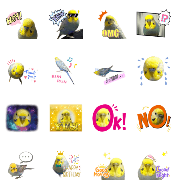 セキセイインコ(レインボー)のピナちゃんスタンプ第2弾です。使いやすい言葉と第1弾より少し太ったピナ氏。